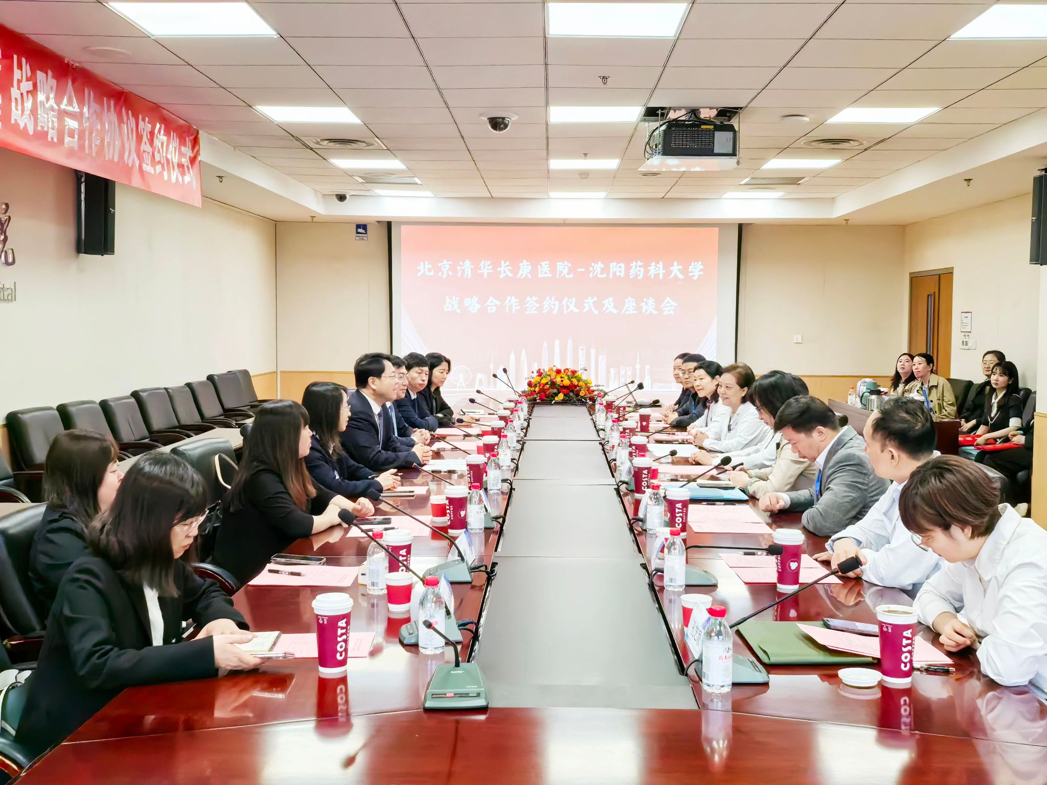 北京清华长庚医院行政总助、学科规划办公室、教学部、科研部、 医务管理部、药学部负责人,我校党政办公室、发展规划处、科研处、研究生院、临床药学院、工商管理学院、对外合作与交流办公室负责人和临床药学学科负责人参加签约仪式。